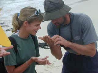 Kelly and Jan (pronounced Yon) inspect the green sand of one of Isla Floreana's beaches. This sand was created by volcanic rocks