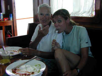 Fran (USA) tries to explain Fritz's love for chicken carcasses while Kelly (USA) scrapes her plate for every last morsel of food.